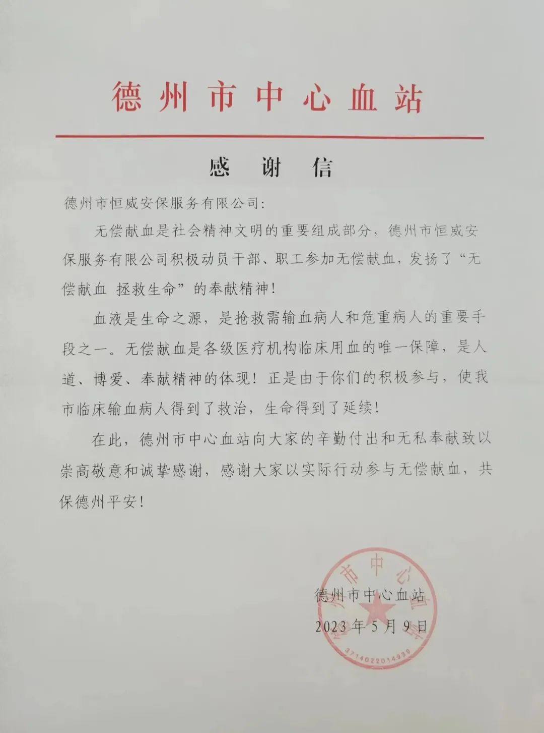 5月9日,德州市恒威安保服務(wù)有限公司組織開展“獻(xiàn)出一份血,傳遞一份愛(ài)”無(wú)償獻(xiàn)血活動(dòng),以實(shí)際行動(dòng)支持無(wú)償獻(xiàn)血活動(dòng)。