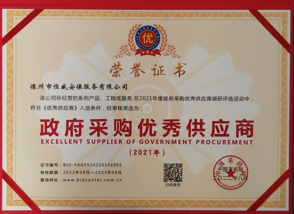 熱烈祝賀!德州市恒威安保服務(wù)有限公司榮獲“,采購(gòu)優(yōu)良供應(yīng)商”榮譽(yù)稱號(hào)