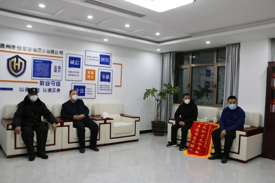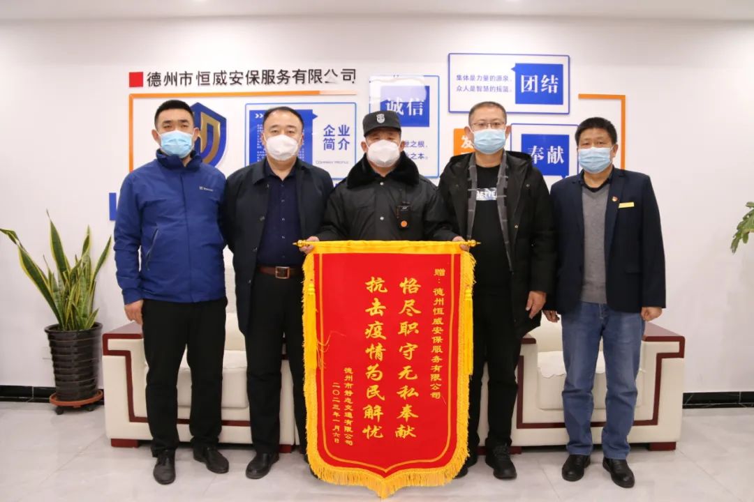 1月13日,德州市靜態(tài)交通有限公司呂強(qiáng)主任一行三人到訪德州市恒威安保有限公司,將寫有“恪盡職守?zé)o私奉獻(xiàn) 抗擊疫情為民解憂”錦旗交予恒威安保手中,公司副總經(jīng)理張玉濤、張有利,七公司大隊(duì)長(zhǎng)高榮海參與接待。