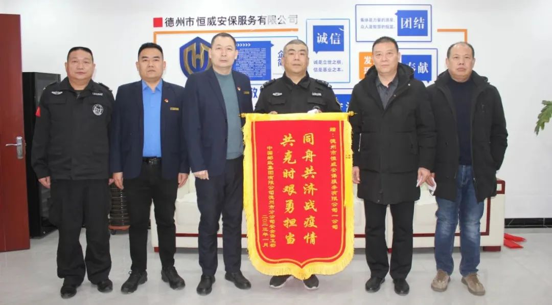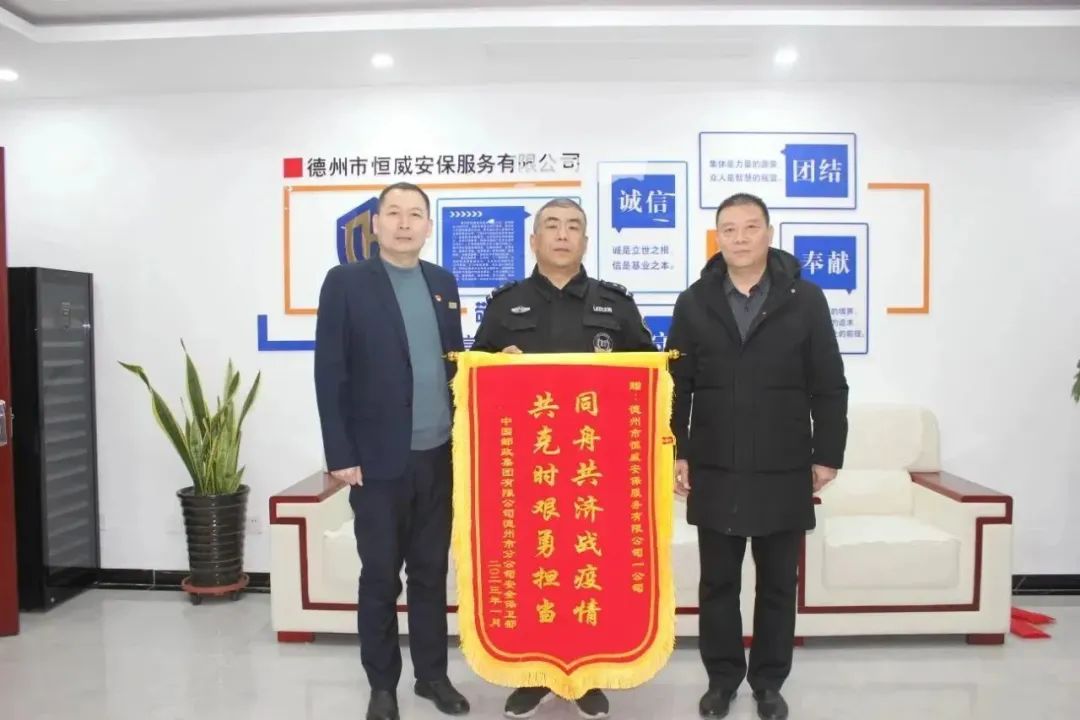 1月17日,中國郵政集團(tuán)有限公司德州市分公司徐峰主任一行到訪德州市恒威安保服務(wù)有限公司并贈送錦旗,贊揚(yáng)恒威安保駐郵政集團(tuán)德州分公司班組履職盡責(zé)、踏實認(rèn)真、勇于擔(dān)當(dāng),特別是在疫情期間安保人員24小時堅守工作崗位,嚴(yán)格防疫,切實為我公司安全有序運(yùn)轉(zhuǎn)提供了有力的安全保障,對恒威安保人所做出的努力及無私奉獻(xiàn)、敬業(yè)忘我的出色表現(xiàn)表示充分肯定和衷心感謝。