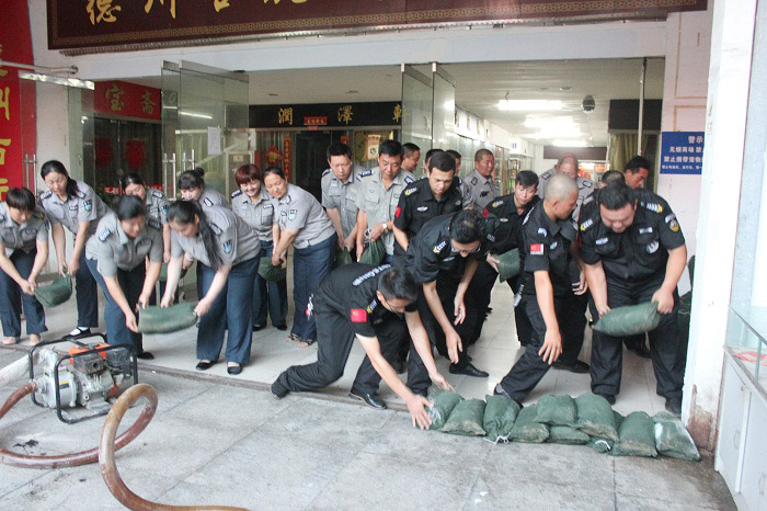 王新剛大隊長現(xiàn)場查勘水情,做簡要戰(zhàn)前動員。按一大隊抗洪搶險應急處置預案迅速將人員分為現(xiàn)場險情處置、大廳警戒疏散、道路車輛管理、搶險物資轉(zhuǎn)運四個戰(zhàn)斗小組,快速投入積水排放、電路維護、人員疏散、構(gòu)筑隔水墻的搶險工作。經(jīng)過近一小時的努力,險情排除,避免了客戶單位的經(jīng)濟損失。