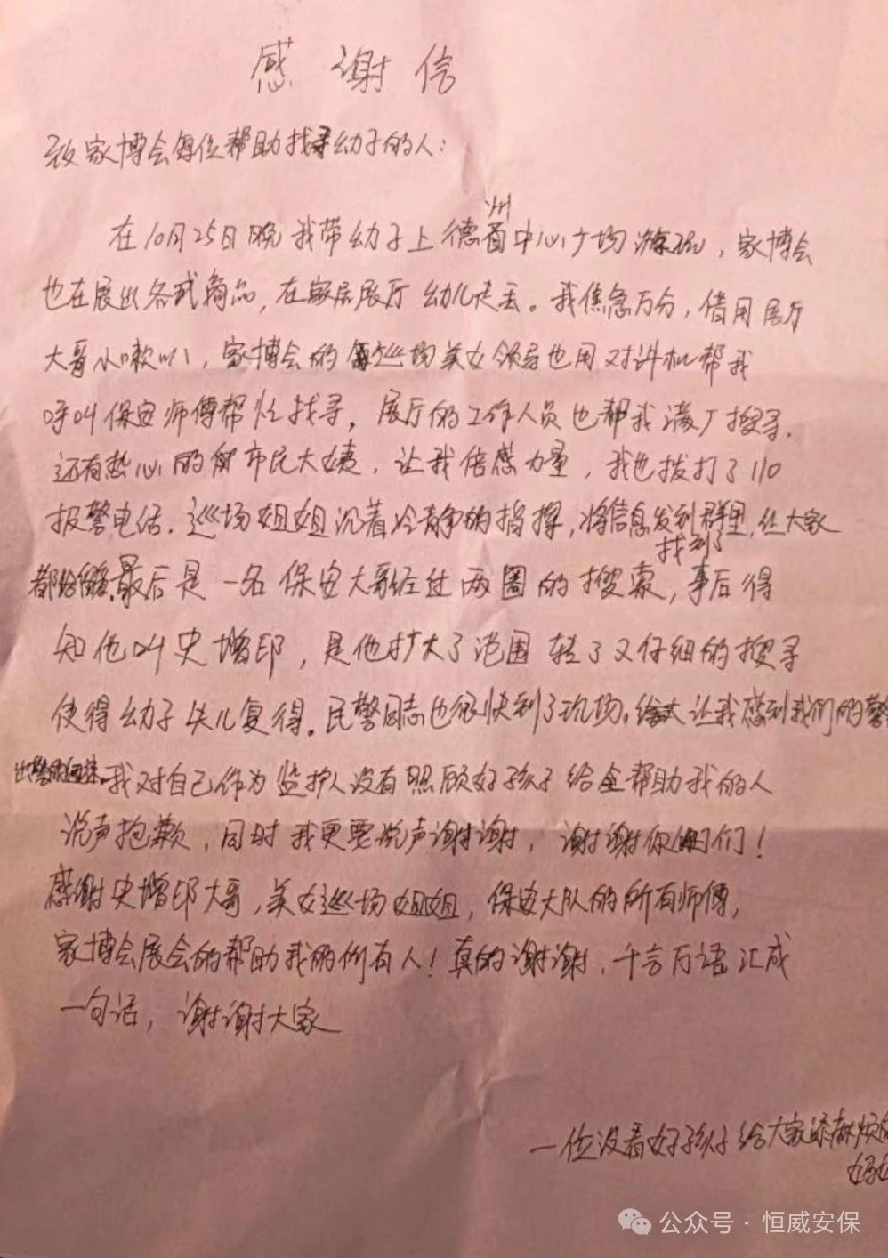 由于展會(huì)占地面積較廣,又正值周末,人流量很大,無(wú)形中增加了尋找難度。隊(duì)員們圍繞著孩子走失的位置,分散開(kāi)來(lái)擴(kuò)大范圍繼續(xù)尋找,終于找到了走失的幼童。孩子?jì)寢寣?duì)恒威保安員及家博會(huì)工作人員的幫助表示了衷心的感謝。同時(shí),家博會(huì)主辦方也對(duì)恒威執(zhí)勤工作人員的果斷和擔(dān)當(dāng)給予了高度贊賞。