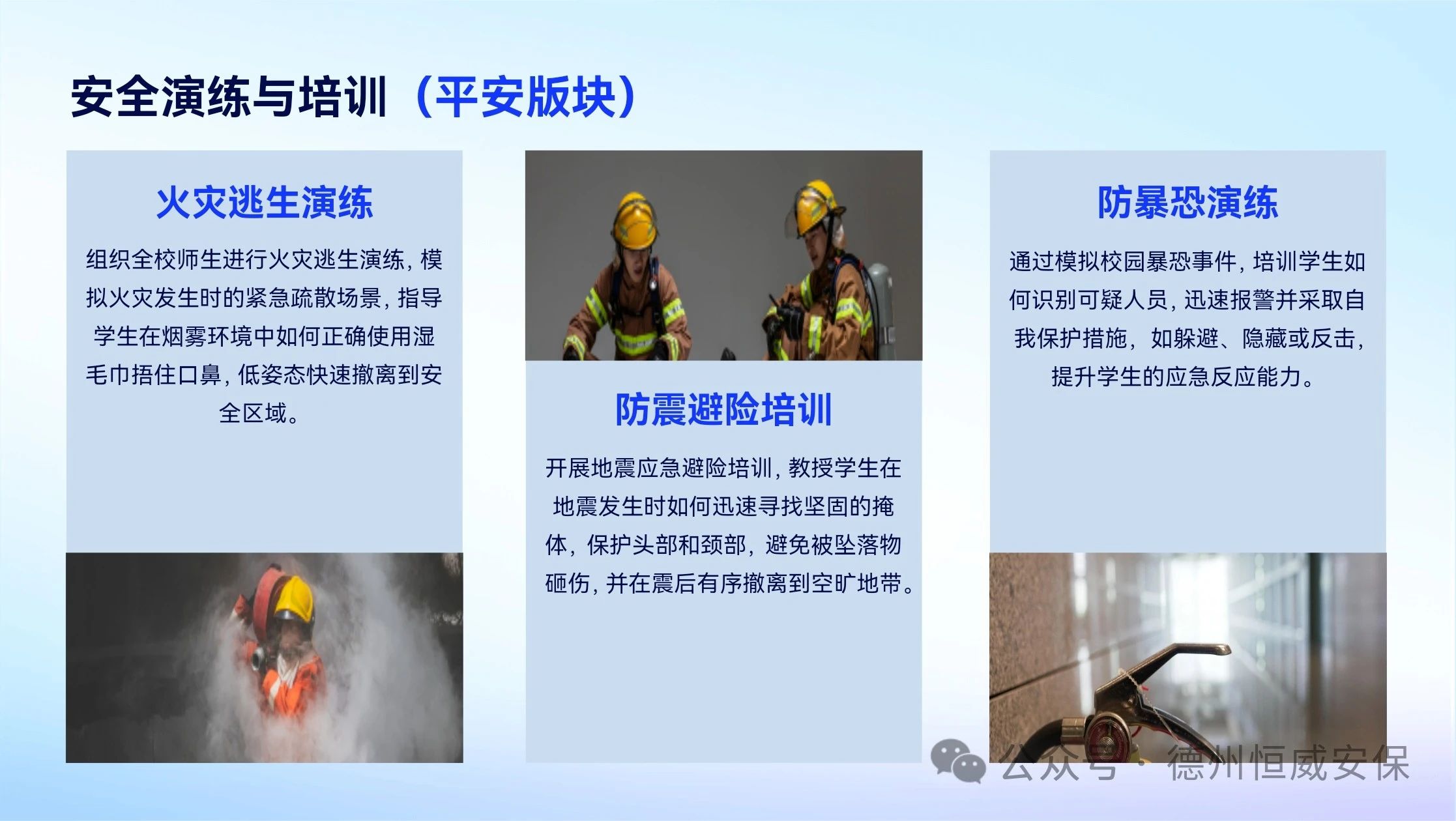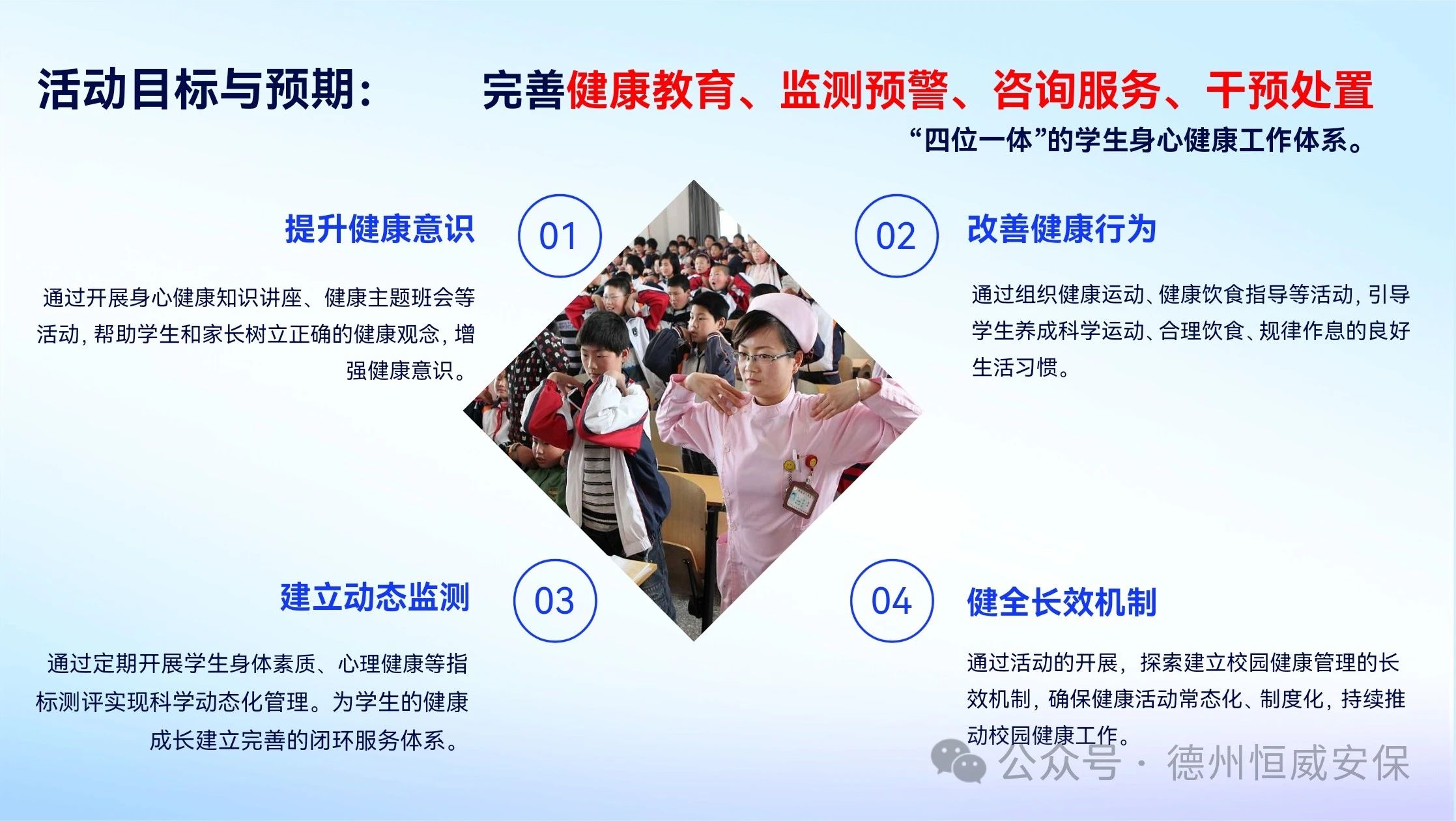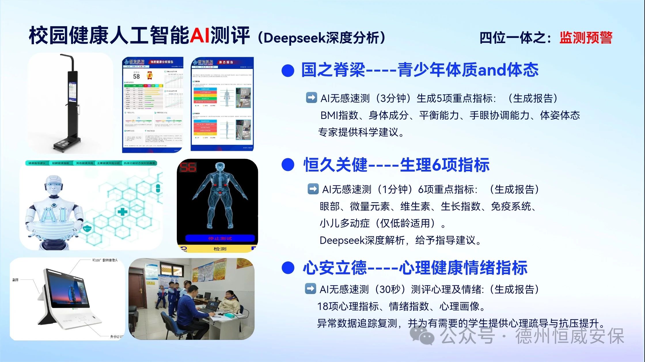 會(huì)上,公司恒心AI心理測(cè)評(píng)中心負(fù)責(zé)人趙海峰,就主題為“恒久關(guān)健·心安立德”的“平安·健康校園行”活動(dòng)方案進(jìn)行了詳細(xì)闡述。方案明確提出,通過(guò)AI科技賦能學(xué)生身心健康測(cè)評(píng)與提升工作,助力完善“四位一體”學(xué)生身心健康工作體系。此外,活動(dòng)還精心規(guī)劃了校園火災(zāi)逃生演練、地震避險(xiǎn)演練以及升級(jí)版校園防暴恐應(yīng)急演練等一系列大型演練項(xiàng)目。