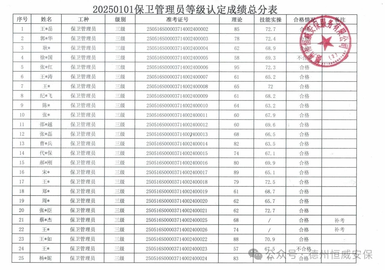 德州市第二批保衛(wèi)管理員(三級(jí))職業(yè)技能等級(jí)認(rèn)定成績(jī)公示: